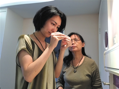 6 de abril de 2015. Liu Ting ayuda a su madre a enhebrar una aguja después de su operación de cambio de sexo. (Foto/Beijing News) |
