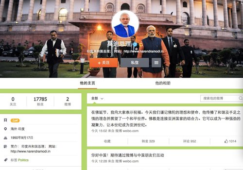 Pekín,05/05/2015(El Pueblo en Línea)-El primer ministro indio Narendra Modi llamó la atención de miles de internautas el lunes tras la apertura de su cuenta en una de las redes sociales más populares de China, justo antes de su visita al país este mes.