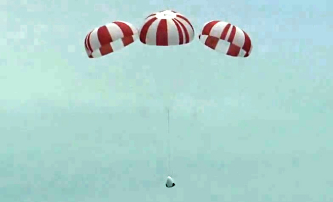Los motores de un cohete Falcon impulsaron la cápsula durante seis segundos, e inmediatamente después la cápsula Dragon se desprendió y tres paracaídas se abrieron para que la nave descendiera sobre la superficie del agua, cerca de la costa, donde fue rescatada por barcos.