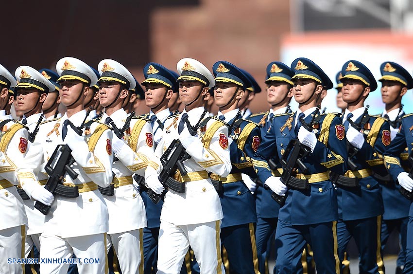 MOSCU, 9 may (Xinhua) -- La guardia de honor china está desfilando en la Plaza Roja como parte de la parada militar que Rusia celebra hoy sábado para conmemorar el 70o aniversario de la victoria en la Segunda Guerra Mundial (Gran Guerra Patriótica según la terminología rusa).