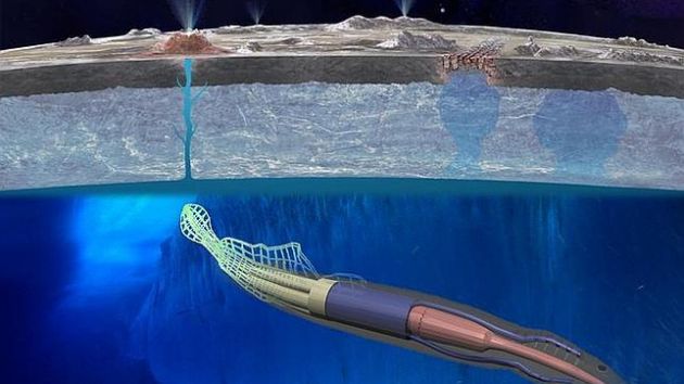 EEUU.,12/05/2015(El Pueblo en Línea)-La NASA ha presentado un nuevo proyecto con el que se pretende buscar vida en los océanos subterráneos de la luna de Júpiter, Europa. Se trata de una de las 15 iniciativas presentadas dentro del concurso Conceptos Avanzados e Innovadores de la NASA (NIAC) y consiste en un robot con forma de calamar gigante con una antena corta en su parte posterior que obtendría energía a partir de la carga local de los campos magnéticos.
