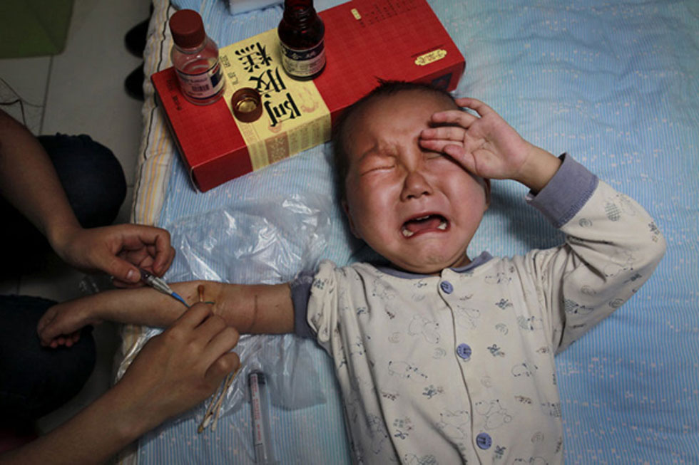 Zhang inyecta a su hijo de tres a?os la medicina que le ayuda a trata la leucemia en su casa, el 7 de mayo de 2015. Zhang Wei hace de enfermera para evitar pagar tantos gastos médicos.