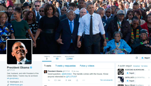Con tan sólo tres tuits, la cuenta de Obama, con el nombre de usuario @POTUS (el acrónimo de President Of The United States) ya superaba el millón y medio de seguidores por la ma?ana.