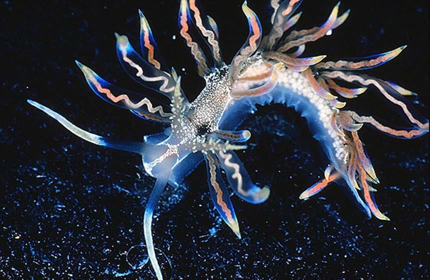 7 Phyllodesmium acanthorhinum: Esta babosa de mar muy bella por sus formas y colores es un eslabón perdido entre las babosas de mar que se alimentan de hidroides (organismos marinos entre los que se encuentran las medusas) y las que se alimentan de corales. Puede medir tres centímetros y vive en Japón.