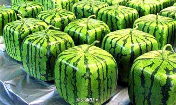Nanjing,25/05/2015(El Pueblo en Línea)-El 23 de mayo, se puso a la venta en la gran sala del Supermercado de Servicios de Tecnología Rural de Jiangsu una variedad de sandías con formas especiales. Los campesinos pusieron un molde especial antes de que las sandías empezaran a crecer (alrededor de 10 días después de la floración y crecimiento del fruto), y retiraron el molde a las dos semanas, y después de más de 10 días de maduración de la fruta para su comercialización. (Foto: Weibo oficial de CCTV)