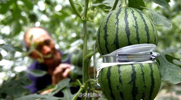 Nanjing,25/05/2015(El Pueblo en Línea)-El 23 de mayo, se puso a la venta en la gran sala del Supermercado de Servicios de Tecnología Rural de Jiangsu una variedad de sandías con formas especiales. Los campesinos pusieron un molde especial antes de que las sandías empezaran a crecer (alrededor de 10 días después de la floración y crecimiento del fruto), y retiraron el molde a las dos semanas, y después de más de 10 días de maduración de la fruta para su comercialización. (Foto: Weibo oficial de CCTV)