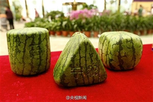 Nanjing,25/05/2015(El Pueblo en Línea)-El 23 de mayo, se puso a la venta en la gran sala del Supermercado de Servicios de Tecnología Rural de Jiangsu una variedad de sandías con formas especiales. Los campesinos pusieron un molde especial antes de que las sandías empezaran a crecer (alrededor de 10 días después de la floración y crecimiento del fruto), y retiraron el molde a las dos semanas, y después de más de 10 días de maduración de la fruta para su comercialización. (Foto: Weibo oficial de CCTV)