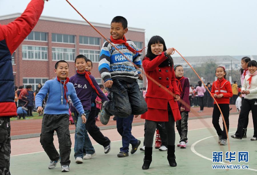Alumnos juegan a saltar la comba en una escuela primaria en Yidu, Hubei. (Foto: Lida Cao)