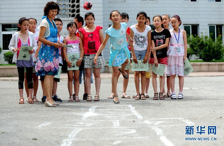 Alumnos juegan Rayuela en una escuela primaria en Shenyang, Liaoning. (Foto: Zhang Wenkui)