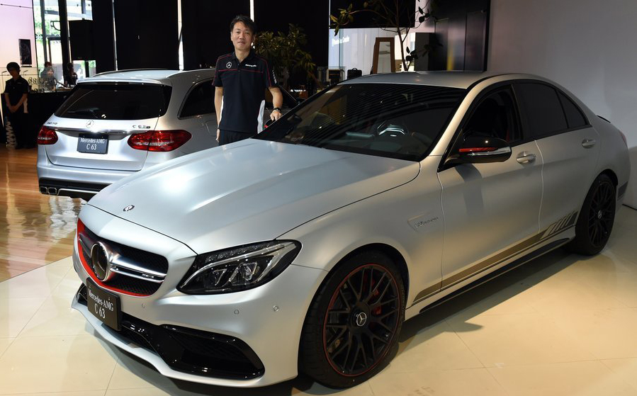 Mercedes-Benz Japón Presidente y CEO Kintaro Ueno se plantea entre nuevo Mercedes-AMG C63 S edición 1 (R) y Mercedes-AMG C63 S ranchera de la empresa (L) durante la vista previa de su prensa en Tokio el 27 de mayo de 2015. [Foto /Agencias]