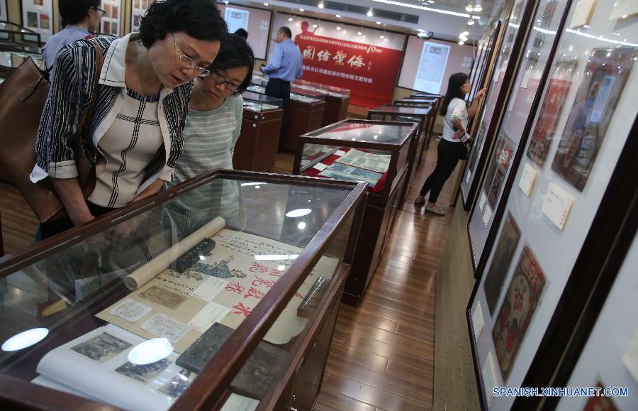 Visitantes observaban periódicos publicados durante la guerra anti-Japonesa en una librería de libros históricos en la ciudad oriental china de Shanghai el 10 de junio de 2015. Más de 400 periódicos antiguos publicados durante la guerra con unlapso del a?o 1931 hasta 1946 serán exhibidos en Shanghai hasta el 16 de este mes.