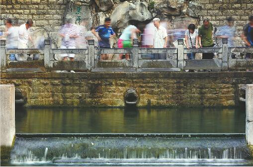 Jinan, 15/06/2015(El Pueblo en Línea)-Residentes locales hacen fila para recoger agua del manantial Heihu en Jinan, provincia de Shandong, el 14 de junio de 2015. El famoso manantial Heihu (tigre negro) dejó de dar de agua el domingo a consecuencia de la escasez de agua agua subterránea. El agua de este lugar es tan limpia que muchos residentes locales se la llevan a casa. El manantial “tigre negro”, situado en la parte sur del foso de la ciudad, es la segunda fuente de agua más importante de Jinan. El agua del manantial emana de una cueva a través de tres cabezas de animal de piedra en forma de cascada, que caen desde una altura de 28 metros en una piscina de piedra que mide 13 metros de largo y 9 de ancho. El viento emite un rugido aterrador cuando sopla a través de la cueva por donde fluye el agua hacia fuera, fenómeno que le dio nombre al manantial Heihu o “tigre negro”.