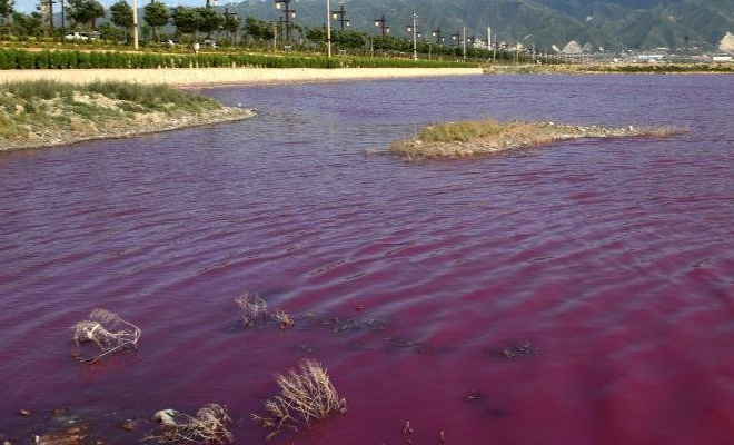 Foto del 11 de junio de 2015 muestra un lago salado rosado en Yuncheng, provincia de Shanxi, el 11 de junio de 2015.