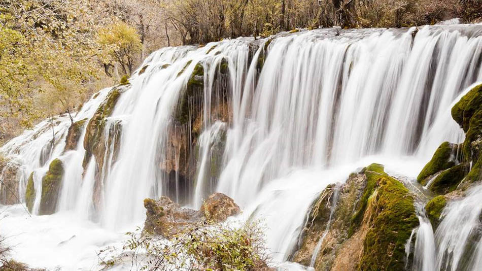 Cataratas de la playa de la perla: Situadas en la prefectura autónoma de las minorías tibetana y Qiang, provincia Sichuan, China. Las cataratas se encuentran a más de 2.500 metros sobre el nivel del mar. Rodeadas por las rocas, el agua golpea con tanta fuerza la tierra que las gotas saltan como perlas bajo el sol.