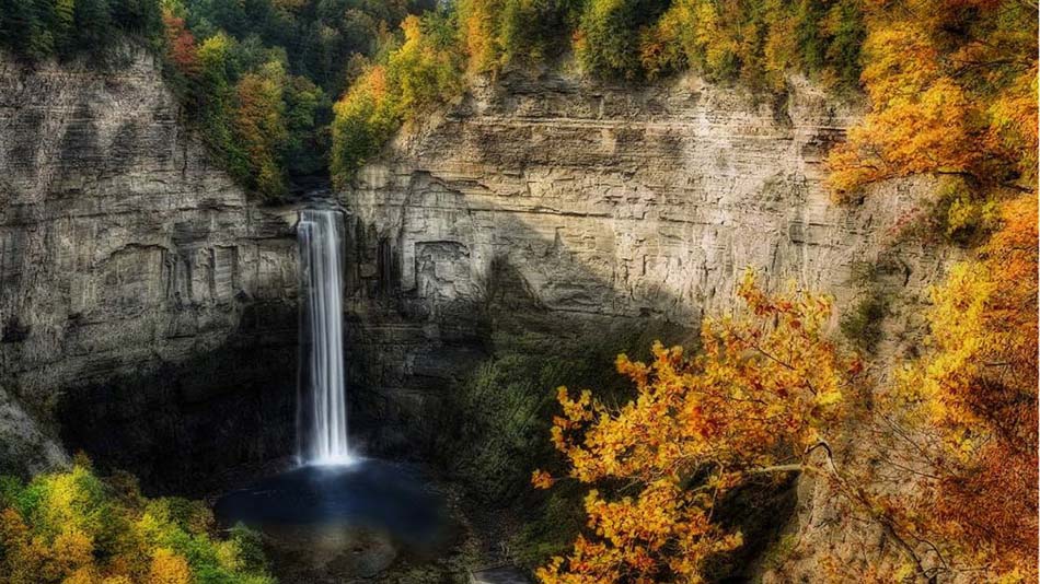 Cataratas Taughannock: Situadas en el Parque del Estado de Nueva York, se forman con el agua del Lago Cayuga y están rodeadas por un valle de 122 metros de profundidad. La parte principal de las cataratas tiene una caída de 65 metros, haciendola la cascada más alta al este de las Monta?a Rocosas.
