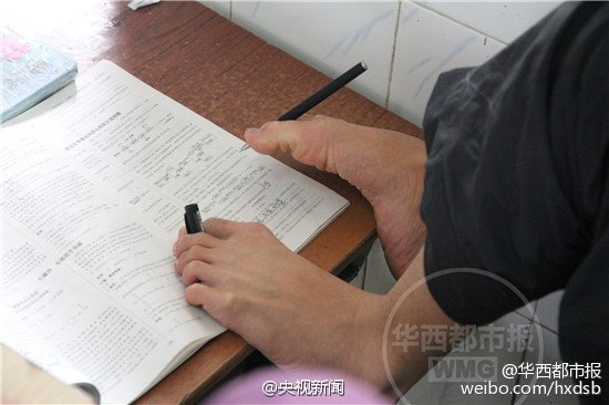 Pekín, 24/06/2015(El Pueblo en Línea)-Un estudiante sichuanés que no tiene brazos realizó el examen de acceso a la universidad pública, o gaokao, principios de junio utilizando sus pies, y consiguió la increíble nota de 603 puntos. El joven ha decidido enviar una solicitud de matrícula a varias universidades importantes de la provincia.