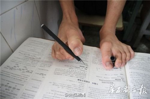 Pekín, 24/06/2015(El Pueblo en Línea)-Un estudiante sichuanés que no tiene brazos realizó el examen de acceso a la universidad pública, o gaokao, principios de junio utilizando sus pies, y consiguió la increíble nota de 603 puntos. El joven ha decidido enviar una solicitud de matrícula a varias universidades importantes de la provincia.