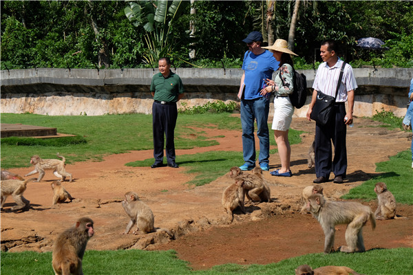 Los visitantes se acercan a los monos en el Parque Zoológico Tropical y Jardín Botánico de Hainan, el 9 de junio de 2015. [Foto por Huang Yiming/China Daily] |
