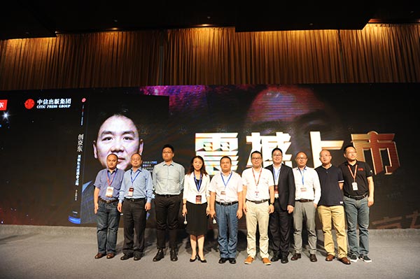 Pekín, 02/07/2015(El Pueblo en Línea)-Li Zhigang, autor del libro (quinto a la izquierda) junto a analistas, comerciales y funcionarios de la empresa Jingdong, durante la presentación de "Fundando Jingdong", un libro que testimonia la historia de cómo un peque?o puesto de venta creció y llegó a ser, en menos de 20 a?os, una poderosa empresa internacional de comercio electrónico.