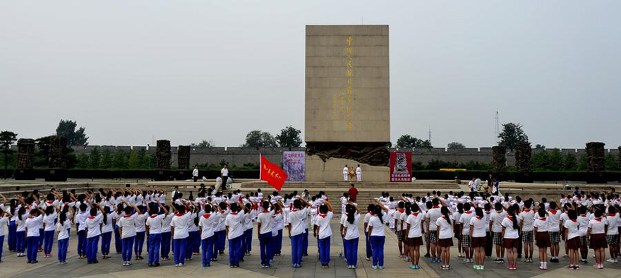 Los estudiantes de primaria de los colegios Puente Lugo 1 y 2 honran a lo héroes que lucharon contra la agresión japonesas en el jardín de esculturas conmemorativo de la guerra de resistencia contra la agresión japonesa, en el distrito Fengtai de Pekín, el 1 de septiembre de 2014. [Foto/Xinhua]