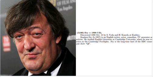 Londres,07/07/2015(El Pueblo en Línea)-El asteroide 1999 UR2, uno de los cuerpos celestes del principal cinturón de asteroides situado entre las órbitas de Marte y Júpiter, ha sido oficialmente nombrado 5190 Fry en honor al actor, comediante y dramaturgo británico Stephen Fry.