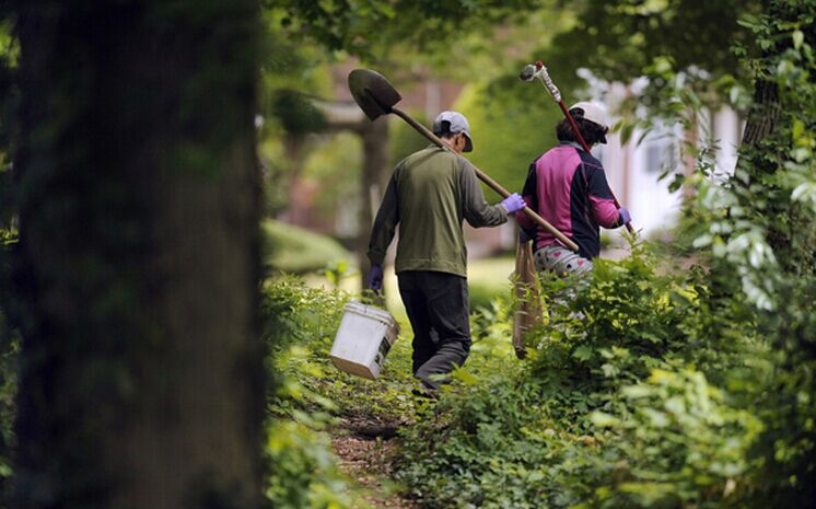Wang Nairu (IZQ) y Xue Yafu regresan a casa después de terminar de plantar en el jardín.