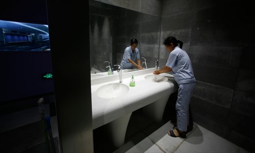 Una trabajadora limpiando el lavabo del ba?o. El lavabo también está hecho con impresión 3D. Foto de Yang Hui/GT |