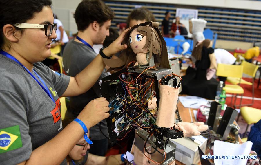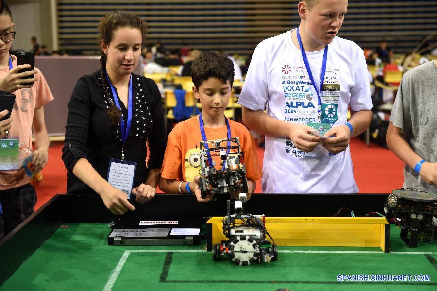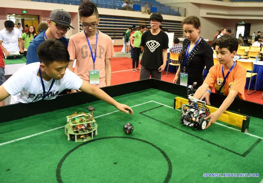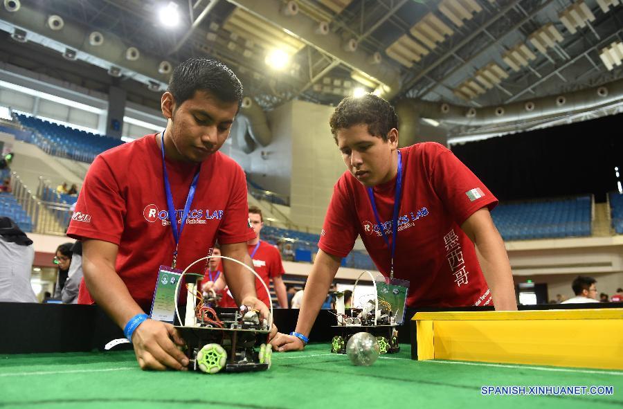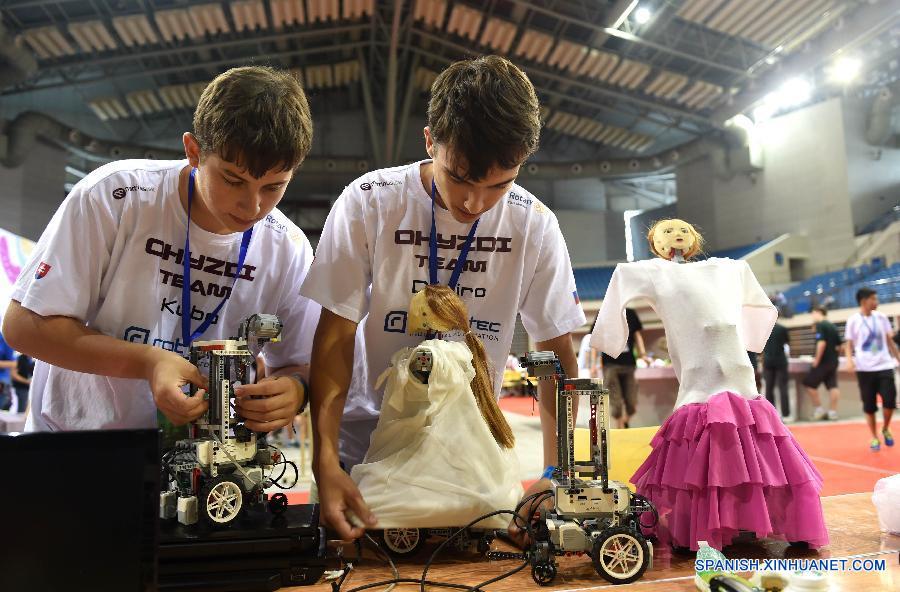 Participantes de los grupos de adolescentes ajustaron sus robots en el Centro de Deportes Olímpicos en Hefei, capital de la provincia oriental china de Anhui el 18 de julio. La XVIIII Copa de Robot se inauguró el domingo, en la que más de 2000 participantes provenientes de 47 países y regiones participan.