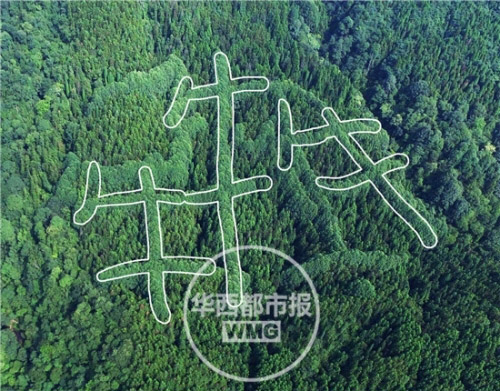 Chengdu, 22/07/2015(El Pueblo en Línea)-Imagen de un carácter chino entre la vegetación que cubre una monta?a en la ciudad de Qionglai, provincia de Sichuan. Foto del 17 de julio de 2015. Se desconoce si se formó de manera natural o los árboles fueron plantados así.