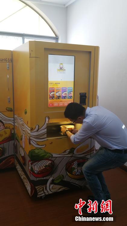 Shanghai, 22/07/2015(El Pueblo en Línea)-La primera máquina expendedora de fideos con carne carne hervida del mundo entró en funcionamiento en Shanghai el 21 de julio. Los clientes pueden elegir el sabor en una pantalla y un minuto más tarde, pueden disfrutar de un plato de fideos con carne cocinados por la máquina. En octubre pretenden instalar más aparatos por la ciudad de Shanghai. (Foto del SNC)