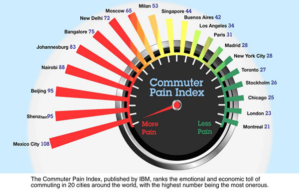 En la lista IBM Global Commuter Pain Index 2011, Pekín fue elegida como la peor ciudad del mundo para desplazarse, según la revista digital Smartplanet. Megaciudades como Nueva York, París o Los ángeles no están incluídas entre las 10 primeras.