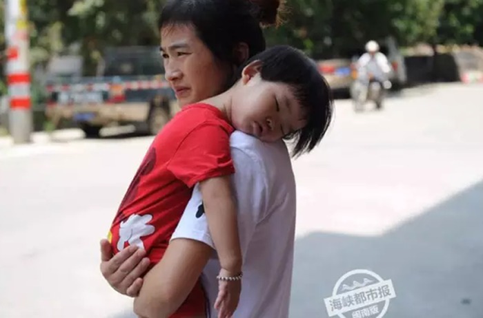 Luo sostiene en brazo a su hija Xiaowen dos horas después de que ella misma persiguiera a una mujer con enfermedad enferma que intentó robarle su hija en Quanzhou, provincia de Fujian, el jueves 30 de julio de 2015.