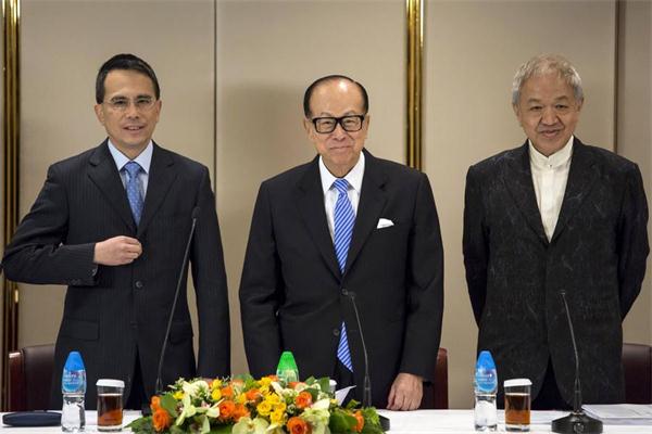 El magnate de Hong Kong, Li Ka-shing (centro), su hijo Víctor Li Tzar-kuoi y el director general de Hutchison Whampoa Canning Fok (derecha) asisten a una rueda de prensa en Hong Kong el 9 de enero de 2015. [Foto agencias]