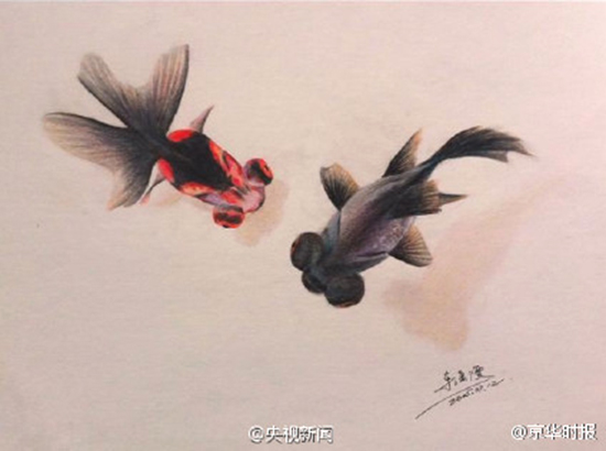 Nanchang, 06/08/2015(El Pueblo en Línea)-Xiaoman, estudiante de la Universidad de Xiushui de Jiangxi, se ha hecho muy popular en las redes sociales con sus impresionantes dibujos de peces pintados con lápices de colores. El joven ha estado dibujando animales por lápices de colores desde este mes de mayo. Como las carpas son un símbolo de buena suerte, Xiaoman desea compartir la buena suerte con más personas.