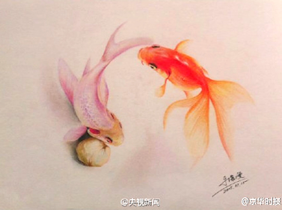 Nanchang, 06/08/2015(El Pueblo en Línea)-Xiaoman, estudiante de la Universidad de Xiushui de Jiangxi, se ha hecho muy popular en las redes sociales con sus impresionantes dibujos de peces pintados con lápices de colores. El joven ha estado dibujando animales por lápices de colores desde este mes de mayo. Como las carpas son un símbolo de buena suerte, Xiaoman desea compartir la buena suerte con más personas.