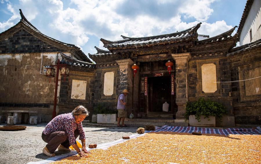 Una granjera seca granos de maíz al sol en la aldea de Tuanshan, prefectura autónoma Hani-Yi de Honghe, provincia de Yunnan. El pueblo Tuanshan es conocido por su arquitectura antigua bien conservada.