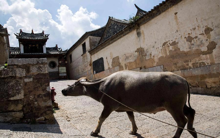 Un toro en la aldea de Tuanshan, prefectura autónoma Hani-Yi de Honghe, provincia de Yunnan. El pueblo Tuanshan es conocido por su arquitectura antigua bien conservada.