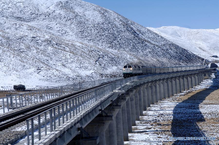 La fotografía tomada el 25 de octubre de 2006 muestra un tren corriendo sobre la meseta en el suroeste de China.