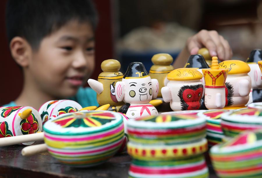 Un ni?o en el pueblo Fannian observa los juguetes de madera con curiosidad.