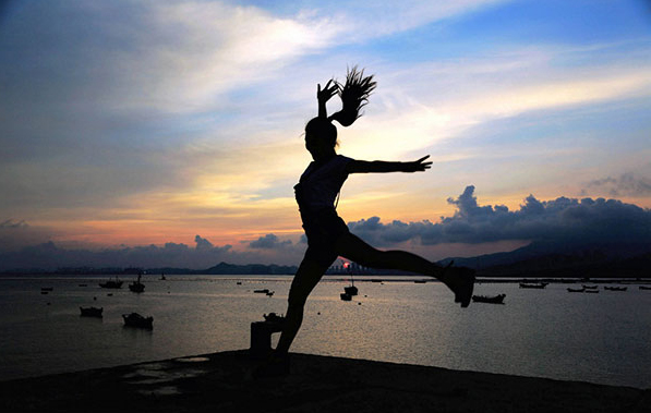 Un turista salta durante la puesta del sol en Qingdao, provincia de Shandong, el 10 de agosto de 2015.