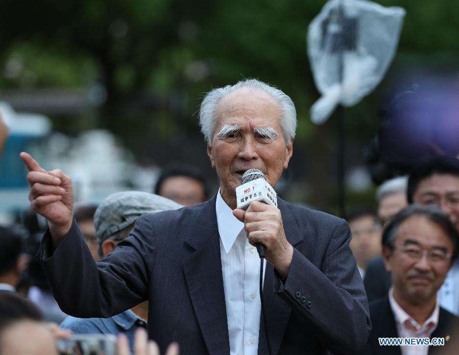 Ex primer ministro japonés Tomiichi Murayama (Centro) ofrece un discurso en Tokio, el 23 de julio de 2015 para protestar contra las estrategias de Abe para reforzar la capacidad del ejército japonés y trastocar la postura "puramente defensiva" del país. (Foto: iu Tian)