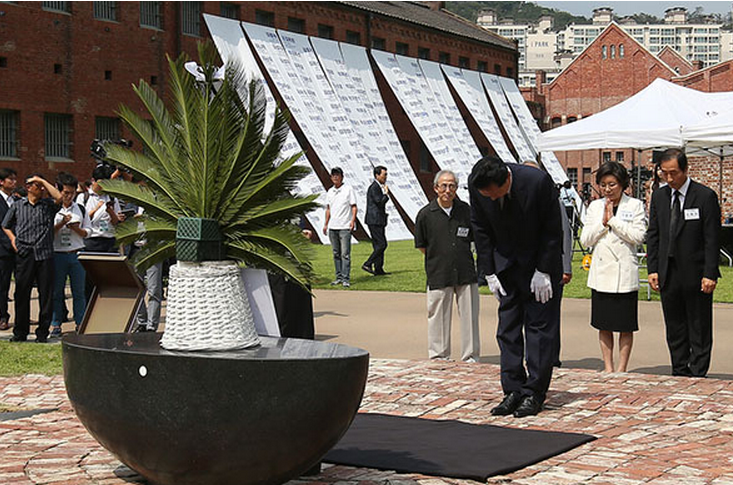 Ex primer ministro japonés Yukio Hatoyama se inclina delante de un monumento de piedra durante su visita a la sala de historia de la Prisión de Seodaemun en Seúl, Corea del Sur, el 12 de agosto de 2015. La prisión de Seodaemun era una prisión donde Japón encarcelaba a los combatientes coreanos durante 1910-1945, período de la colonización de Corea.