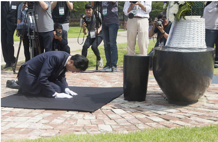 Ex primer ministro japonés Yukio Hatoyama se inclina delante de un monumento de piedra durante su visita a la sala de historia de la Prisión de Seodaemun en Seúl, Corea del Sur, el 12 de agosto de 2015. La prisión de Seodaemun era una prisión donde Japón encarcelaba a los combatientes coreanos durante 1910-1945, período de la colonización de Corea.
