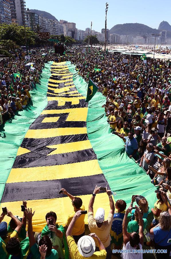 Se trata de la tercera manifestación este a?o en Brasil en contra del Gobierno y de la presidenta Dilma Rousseff, promovidas por la oposición y grupos contrarios al Ejecutivo, ante los casos de corrupción y la desaceleración económica del país, que este a?o debe tener un PIB negativo cercano al menos 2 por ciento.