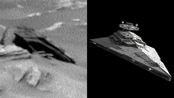 Encontramos la asombrosa fotografía que puedes ver sobre estas líneas en el blog ?UFO Sightings Daily?. No se trata de un montaje ni de un enga?o: es una imagen extraída de la web oficial de la NASA y captada por su astromóvil de exploración, que lleva tres a?os examinando la superficie del planeta rojo. Es difícil saber a ciencia cierta qué es el extra?o objeto que reposa sobre el suelo... pero sin duda, se parece mucho a un Destructor Estelar, un tipo de nave utilizado en los filmes de Star Wars.