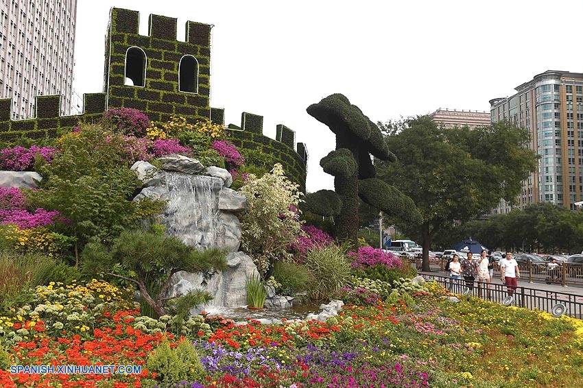 Dos decoraciones florales con la forma de la Gran Muralla han sido instaladas en la plaza de Tian'anmen, donde se celebrará un desfile militar en que participarán unidades chinas y extranjeras la próxima semana. Decoraciones florales de tama?o más peque?o han sido colocadas a lo largo de la avenida Chang'an, una importante vía que cruza Beijing.