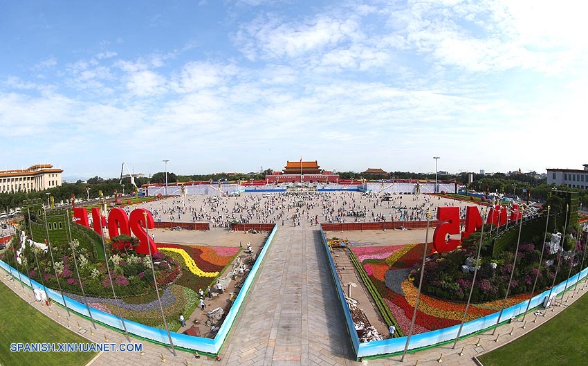 BEIJING, 29 ago (Xinhua) -- Las decoraciones de flores y luces de la plaza de Tian'anmen, en el centro de Beijing, capital de China, se han completado para las celebraciones con motivo del 70o aniversario del fin de la II Guerra Mundial.
