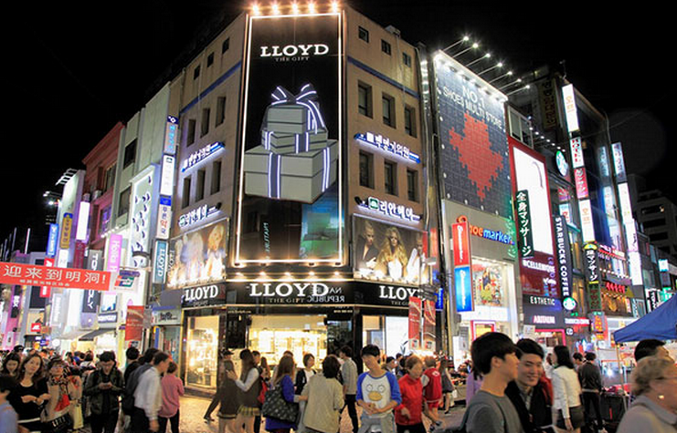 Myeong-dong, distrito comercial muy conocido en Seúl, Corea del Sur.