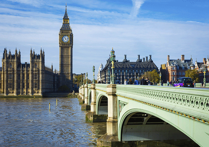 El Big Ben, el Parlamento y el puente de Westminster visto desde el río Támesis, Londres.
