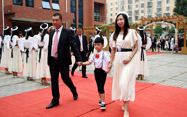 Un total de 30 alumnos de primer grado y sus padres caminaron por una alfombra roja en una escuela primaria en Luoyang, provincia de Henan, el 1 de septiembre de 2015, para celebrar esta ocasión tan especial.